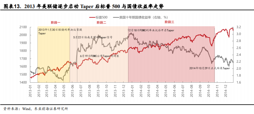 阶段三(实施Taper):美债收益率回落,美股走升。2013年12月18日美联储FOMC议息会议结束后正式宣布了Taper的开启,此时美债收益率开始回落,而该预期内的政策变动也未再改变美股的上涨态势。