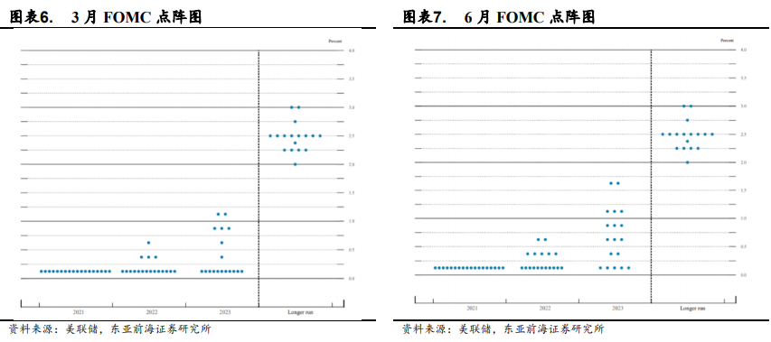 多名票委近期观点偏鹰。当前美联储内部就经济前景与政策已出现分歧,圣路易斯联储主席布拉德、亚特兰大联储主席博斯蒂克、费城联储主席哈克和达拉斯联储主席卡普兰支持短期内就缩减QE,而纽约联储主席威廉姆斯、芝加哥联储主席埃文斯等官员认为需要看到劳动力市场的进一步进展。6月的点阵图也显示越来越多的美联储官员转向“鹰派”,大多数官员预计2023年底前或加息两次。