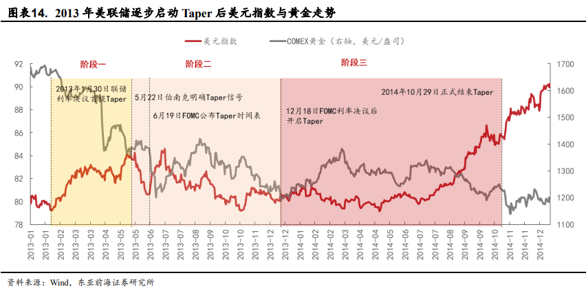 阶段一(讨论Taper):美元指数上行。2013年1月30日联储开始讨论Taper至Taper信号正式释放前,美元指数快速上行,并对黄金构成利空,这一趋势在在5月市场预期发酵阶段得到了强化,黄金表现较为疲软。