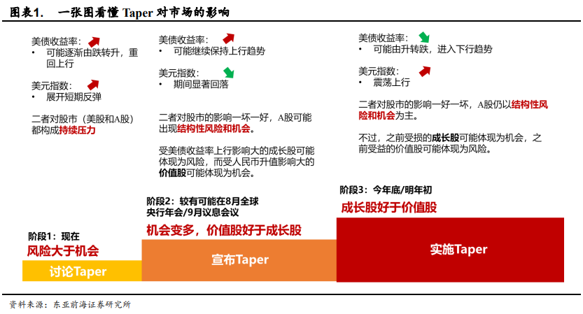 对于A股而言,参考上一轮Taper来看对于A股的影响偏结构性。当前我们位于阶段一,此时A股总体风险大于机会。而随着缩减购债提上日程,阶段二与阶段三中A股可能将会呈现出结构性风险和机会:在Q3 Taper信号释放后,价值股表现占优,直到今年底明年初美联储正式开始缩减后,风格有望切换至成长。