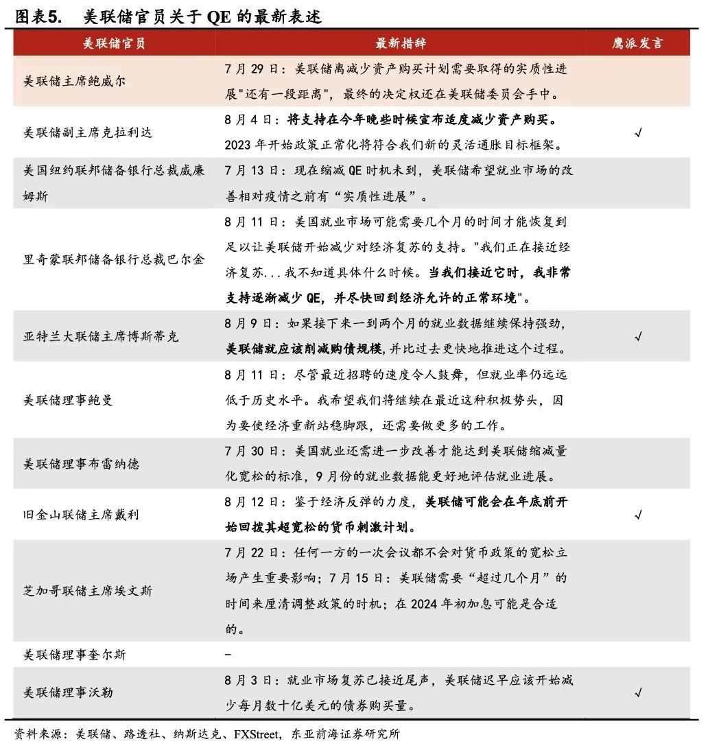 当前市场处于美联储政策收紧预期日益增强的窗口期,劳动力快速修复背景下联储8月宣布缩表的概率升温。第一,从美联储最为关注的就业指标来看,7月美国非农数据大超预期,已经满足触发Taper的条件。第二,6-7月美联储议息会议显示联储态度已经开始边际转鹰。美联储已经开始讨论缩减资产购买,多名票委近期观点偏鹰,6月的点阵图也显示越来越多的美联储官员转向“鹰派”,大多数官员预计2023年底前或加息两次。