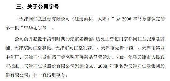在其招股说明书(申报稿)中,天津同仁堂对公司字号专门进行了解释。公司称,“天津同仁堂股份有限公司(注册商标:太阳)”系 2006 年商务部认定的第一批“中华老字号”。