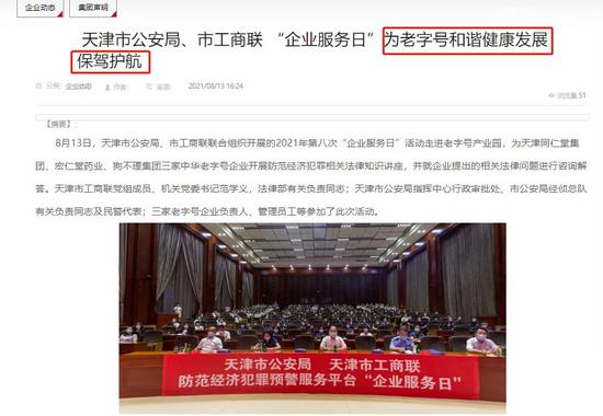 不过,在北京同仁堂发布声明的当日,天津同仁堂在官网上挂出了一则颇有意味的企业动态稿件——天津市公安局、市工商联 “企业服务日”为老字号和谐健康发展保驾护航。