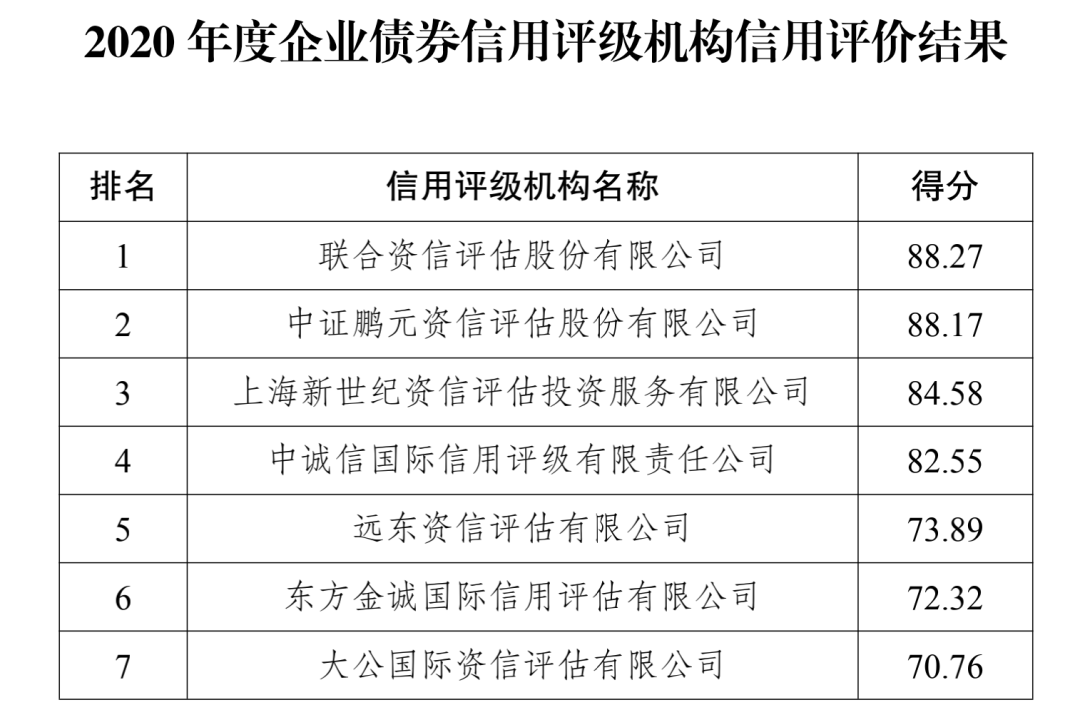 同时,还公布了信用评级机构信用评价结果,7家信用评级机构平均得分为80.08分,联合资信评分第一。