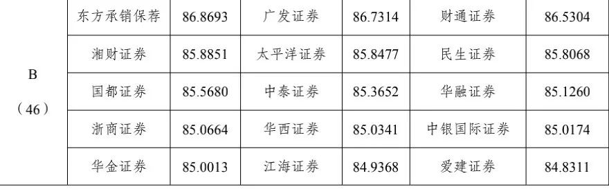 C类名单和去年相比有比较大的变化,万和证券、德邦证券、宏信证券、新时代证券、东海证券、瑞信方正都是从2019年的更高级别滑入C类。比如,2019年,德邦证券的评分是86.63,在B类中也属于中上,但是今年变成了C类。
