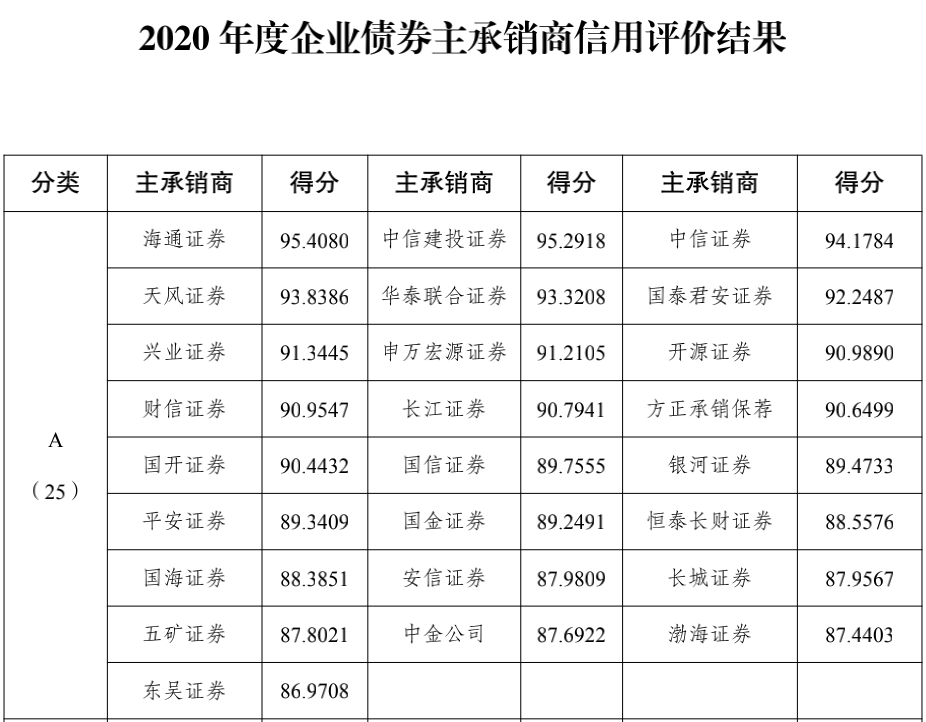 8月20晚间,国家发展改革委办公厅公布2020年度企业债券主承销商和信用评级机构信用评价结果,按照评价得分由高至低排序,将84家受评主承销商分为A、B、C三类。其中A类主承销商25家。