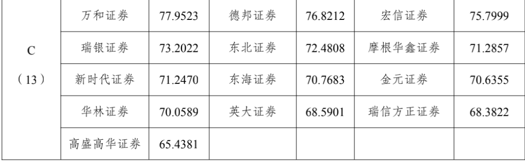 值得注意的是,有13家机构被评为了C类,分别是德邦证券、万和证券、瑞银证券、新时代证券、华林证券、高盛高华证券、东北证券、东海证券、英大证券、宏信证券、摩根华鑫证券、金元证券以及瑞信方正证券。