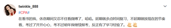 还有网友对此表示,在看书的我,休息期间又忍不住看微博了,哈哈。延期就多点时间复习,不延期就按现在的节奏看,考过了开开心心,考不过明年我继续报考,反正有了学习经验了。