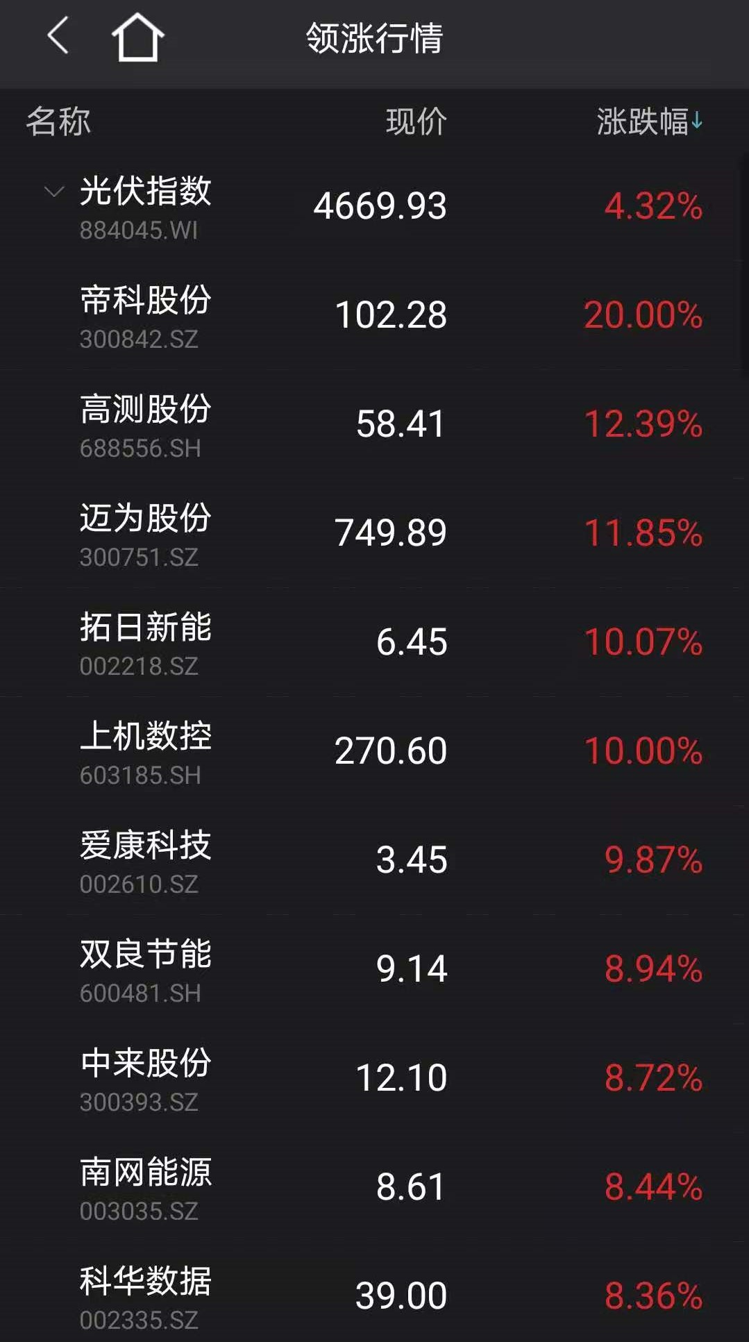 同属新能源领域的光伏板块今日也迎风起舞。Wind数据显示,光伏指数上涨4.32%,帝科股份、拓日新能、上机数控、爱康科技集体涨停,双良节能、中来股份、南网能源、科华数据等上涨逾8%。