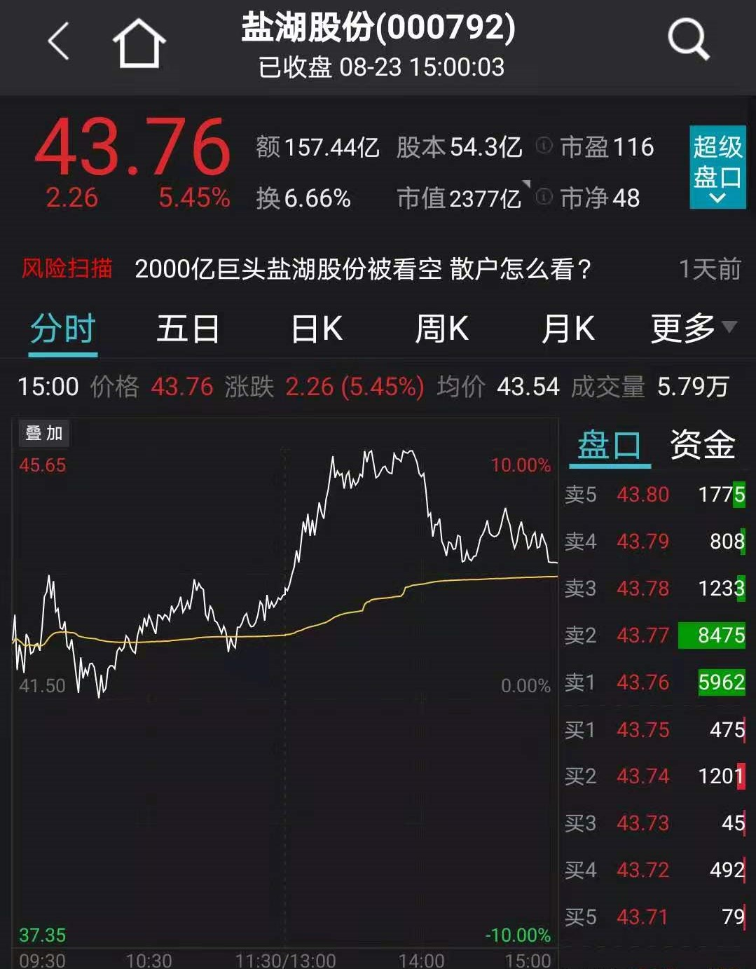 备受关注的盐湖股份今日创下了摘帽后股价新高。Wind数据显示,盐湖股份今日高开高走,截至收盘涨5.45%,盘中公司股价一度触及45.65元/股,创近11年来新高,总市值也一度站上2400亿元关口。