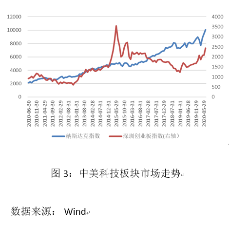 其次,独角兽的出现有其相对稳固的产业基础。令人记忆犹新的2000年互联网泡沫,尽管没有实现广泛的网络技术商业化,却帮助形成了早期的互联网产业基础。网络软件和硬件、数据服务、网络安全、信息传输等行业从最初主要向消费者提供服务,逐步转向为基于互联网的企业提供配套服务,极大刺激了互联网产业链条的延长和持续完善,为创业企业加快研发产品与服务,以及迅速占领市场提供了必要的产业条件。再次,互联网、新能源、人工智能和医疗技术的突破性发展,为独角兽企业成长提供了天赐良机。根据陈靖等人(2019)的研究,如果企业处于突破性技术创新行业,其成为独角兽的时间会缩短将近6年。目前,信息传输、人工智能芯片及软件、云技术、大数据处理和医疗领域的生物基因技术领域已经成为相对确定的突破性技术创新行业,一批独角兽企业和潜在独角兽企业汇聚于此,受到业界和投资者的广泛关注。最后,大规模的资本注入成为独角兽企业的重要估值基础。2008年金融危机以后,世界性的量化宽松货币政策大幅度增加了资本市场流动性,资金成本明显下降,但传统行业却没有为投资者提供足够的投资机会。此时以互联网为代表的新经济部门发展方兴未艾,为投资者提供了乐观预期和大量投资机会,一些市场基础雄厚、拥有核心技术和完善的产业配套的创业企业特别是平台型企业,受到资本青睐。以瑞幸咖啡为例,根据公开报道,这家企业在上市前仅一年多的时间,至少完成了六轮债权融资和四轮股权融资,新加坡政府投资公司、中金公司、贝莱德资本等著名机构均参与其中。没有宽松的资本市场条件,再好的企业也难以达到如此高的融资密度。公开股票市场的科技股偏好客观上支持了独角兽企业的融资和成长。纳斯达克市场指数从2010年6月份的2100点一路上扬,到今年同期突破1万点;而作为我国国内科技股标杆的创业板指数开市至今也已升至2500点附近(图3)。公开市场对科技股的偏爱,增加了科技型创业企业上市和原始股东退出机会,一定程度上鼓励了私募市场的创业投资热情,潜在独角兽企业估值被持续推高。当然,客观条件的支持并不能代替企业的主观努力。毕竟只有少数创业企业成为独角兽。根据现有研究,具有较强的数据分析和机会搜寻能力、强大研发能力、资源整合能力和较好媒体关系的创业企业,更有可能成为独角兽企业。
