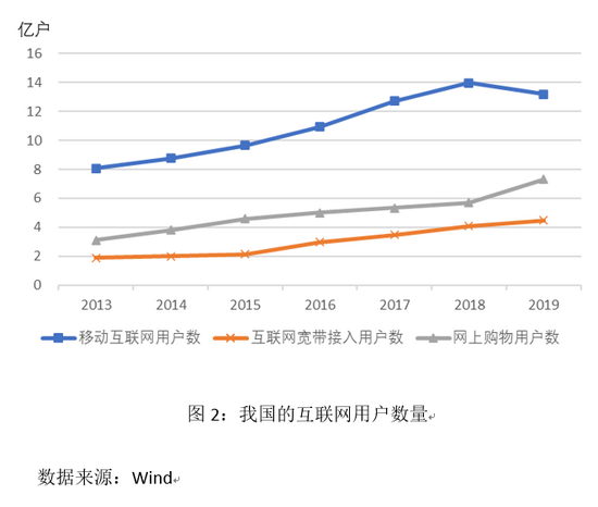 在互联网经济兴起以前,一家企业在几年内就达到10亿美元以上的市值是难以想象的。传统企业从开发出适应市场需求的产品,到建立起自己的营销网络,再到完善足以支撑自身发展的完整产业链,通常需要较长时间和高额成本。互联网的出现帮助相关行业的企业大幅度缩短了成长周期。现有的122家独角兽企业总市值达到4400亿美元,80%以上的企业分布在电子商务、移动通信、汽车交通、人工智能、网络软件和数据服务等直接受益于互联网发展的产业或者互联网周边产业(图1)。根据陈靖等人(2019)对独角兽企业年龄的测算,2000以年以来独角兽企业的成长呈现出加速度特征,企业从创立到市值超过10亿美元,已经从最初的平均13年缩短到2015年以后的2年。由于短时间在特定产业内集中出现了众多独角兽企业,一定程度上颠覆了人们对于创业企业发展路径的认知,形成了引人注目的“独角兽现象”。独角兽现象的出现并非偶然,有其特定的市场基础、产业基础、技术基础和资本基础。首先,独角兽的出现得益于互联网的普及和商用所提供的广阔市场基础。流量变现是早期我国互联网企业的主要发展路径(金雪涛,2020)。庞大的互联网客群、持续增加且日益多元化的市场需求(图2),推动平台型企业营业规模迅速扩大,以京东为代表的电商企业尽管短期内没有盈利,但却凭借其迅速扩大的市场份额使得企业市值一路飙升,后来这些企业陆续实现盈利并在各自领域展现出强大竞争力,印证了资本市场最初的估值判断。