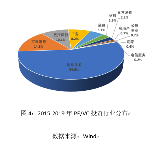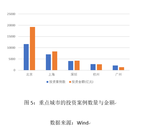 创业投资和私募股权市场是我国资本市场的重要组成部分。自2012年中国证券投资业基金协会成立,并对私募基金进行归口管理以来,私募行业进入规范发展的快车道。尽量今年受到新冠疫情影响,私募行业规模仍然保持上升态势。截止5月末,主要对企业进行早期投资和上市前投资的VC/PE基金数量已经超过3.8万只,基金资产规模达到10.4万亿元。私募机构对创业企业投资相当活跃,据万得数据库统计,2015-2019年的五年间,国内PE/VC机构共进行约7万宗投资,投资总额近6万亿元。信息技术、可选消费、医疗保健、工业和金融类项目位居投资案例数量前列(图4)。相较其他城市,北、上、深、杭、广等重点城市,以较好的高技术产业基础和发展环境,吸引了较多的投资(图5)。将私募机构的投资活动与当前国内独角兽企业的行业和地区分布进行对照,可以发现二者高度契合。如果没有私募行业的高强度投资,我国不会在短时间内出现如此多的独角兽企业。