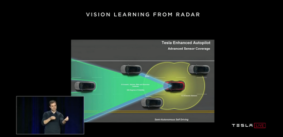 值得一提的是,在他讲解时的背景幻灯片右下角上,清晰地注明了带有毫米波雷达的自动驾驶算法是“Semi-Automonous Self Driving”,翻译过来是,半自动驾驶,明显彼时的特斯拉Autopilot只是个半成品。