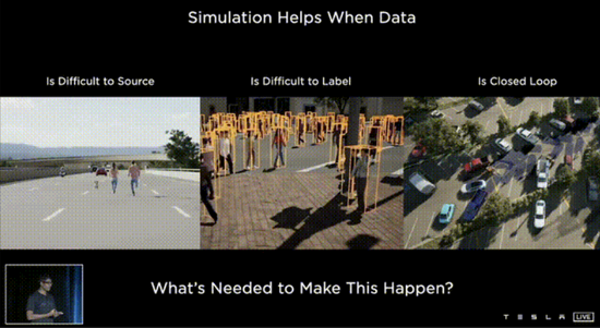 除了能模拟不同城市的交通路况,而且仿真测试还能模拟一些极限场景,比如各种突发交通事件或者极为罕见的交通路况。在AI DAY上,特斯拉工程师举了具体例子,包括有行人在高速路上奔跑、行人数量庞大、或者非常狭窄的驾驶道路。