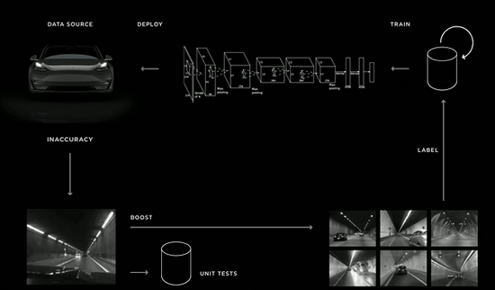 再利用车辆影子模式,但凡遇到实际驾驶情况和自动驾驶AI决策不一致的情况,这部分行车数据会自动上传至特斯拉后台数据引擎中,在被自动标注后,重新纳入已有的数据训练集中,继续训练原本的神经网络,直到新的数据被掌握。