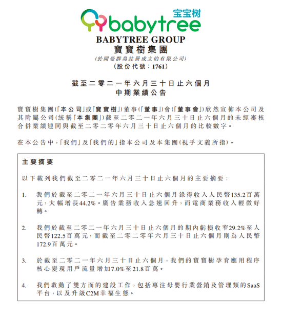 中报显示,2021年上半年,宝宝树营收录得1.35亿元人民币,同比增长44.2%;毛利同比涨幅172.6%,亏损收窄29.2%。