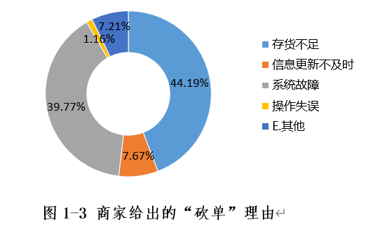 “存货不足”和“系统故障”是电商给出的最主要“砍单”理由。本次问卷调查结果显示,电商在“砍单”后所给出的理由,有4成多(44.19%)受访者称是“存货不足”,占比最高;另有近4成(39.77%)受访者称是“系统故障”。而体验调查结果也显示,各类电商平台在其用户协议中所规定的订单取消或撤销条款中,“存货不足”和“系统故障”也是被提及频次较高的“砍单”理由——在本次体验调查中发现的涉嫌不公平格式条款的17个平台中,有16个都与这两项理由相关。