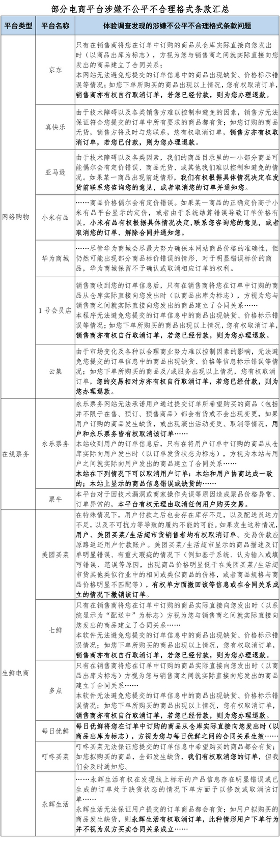 其中,每日优鲜、多点、京东、1号会员店4个平台规定,只有商品从仓库实际发出,方视为与消费者建立了合同关系,涉嫌违反《电子商务法》有关合同成立规定;真快乐、云集、七鲜、亚马逊、多点、京东、1号会员店、小米有品、华为商城、永乐票务、票牛、美团买菜、叮咚买菜、永辉生活、美团优选以及橙心优选16个平台规定,商品缺货、标错价格等情况有权取消订单,涉嫌通过格式条款减轻或免除自身责任;真快乐、多点、京东、1号会员店、云集、七鲜6个平台甚至规定,如果消费者已经付款,则为消费者办理退款,涉嫌违反《电子商务法》“电子商务经营者不得以格式条款等方式约定消费者支付价款后合同不成立”的规定。