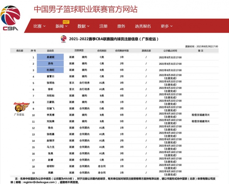 直播吧8月29日讯 CBA官方今日更新了国内球员注册信息,其中,易建联和广东宏远以C类合同续约一年。